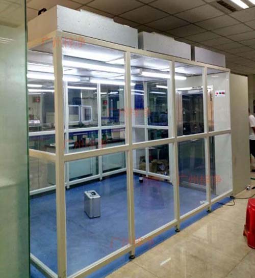 千級潔凈棚(1000級潔凈棚)采用工業(yè)鋁材(或不銹鋼方通、鐵方通噴塑)作為框架,風(fēng)機(jī)濾網(wǎng)機(jī)組(FFU)送風(fēng),四周懸掛防靜電垂簾(或鋼化玻璃),其內(nèi)部凈化級別可達(dá)到100級-10000級。適用于操作區(qū)內(nèi)局部凈化級別要求高的區(qū)域。