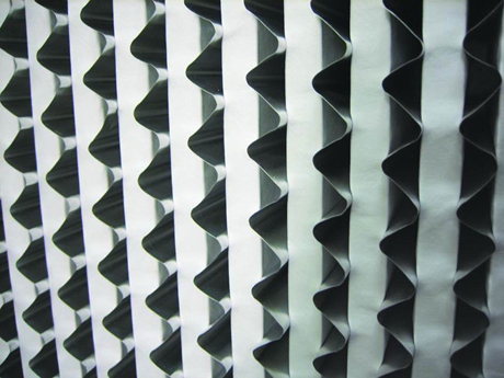 過濾器濾材兩面180度翻折,形成鍥形褶層。濾料折彎時有兩道壓痕,使其在隔板的尾端處形成鍥形盒式摺層,鍥形盒式褶層可以防止濾料破損。有些過濾器生產商采用了單壓痕或滾痕式濾料褶層,甚至簡單地人工折紙,在這種惰況下,濾料很容易被波紋形隔板尖銳的折頂損壞?;蛟谶^多搬運過程中損壞濾紙。